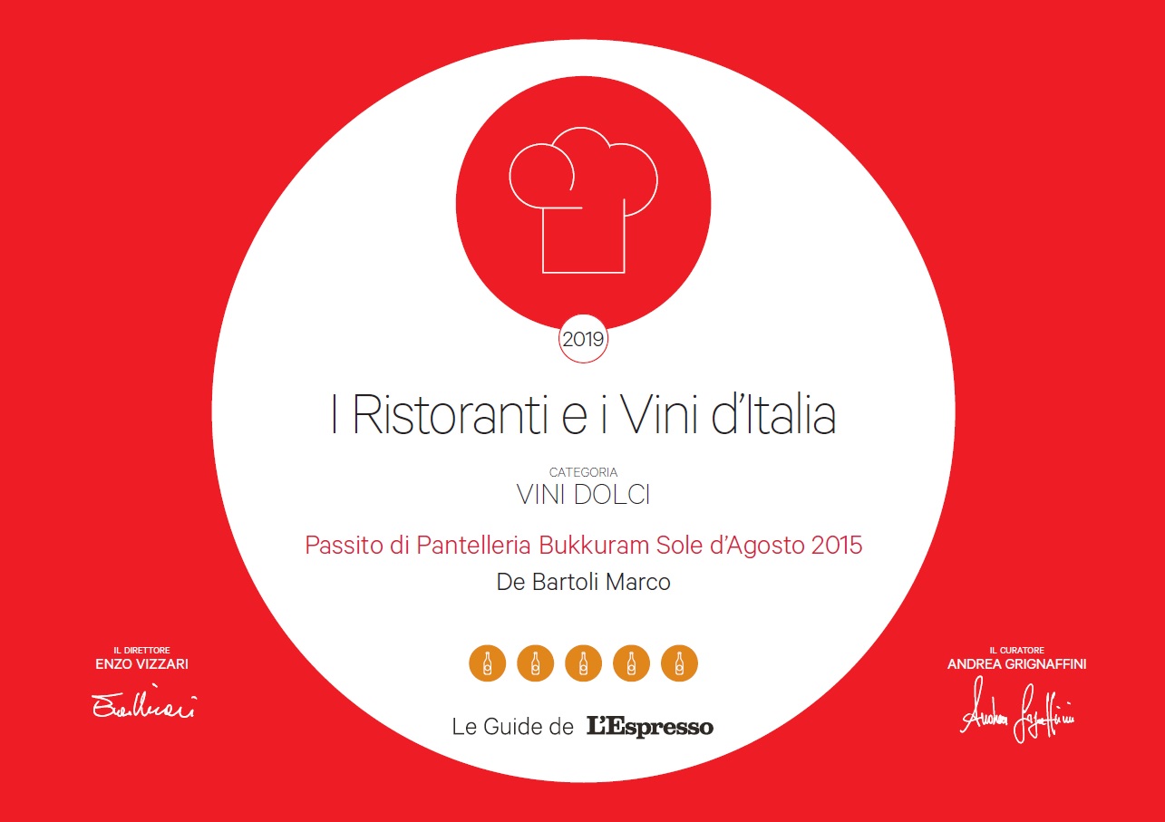 Stamane la presentazione a Firenze, presso il Teatro del Maggio Musicale fiorentino, a partire dalle 10:30. Curata da Andrea Grignaffini, la sezione Vini è dedicata al meglio dei vini del Bel Paese e presenta i migliori 100 vini per tipologia: Spumanti; Bianchi e Rossi, oltre a 30 vini rosati e 30 vini dolci. Tra i “Migliori 30 Vini Dolci” c’è anche lui, il nostro Bukkuram Sole d’Agosto, annata 2015, premiato con le 5 bottiglie, il passito fatto tutti gli anni nell’omonimo vigneto di Pantelleria e ottenuto con le uve appassite naturalmente al “sole d’agosto”. Qui il Diploma in formato digitale assegnato al nostro vino passito di Pantelleria DOC.